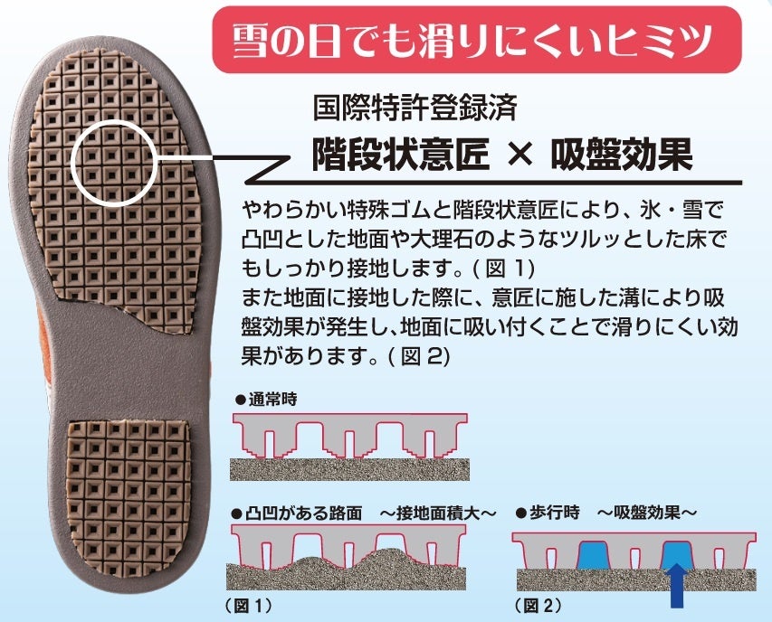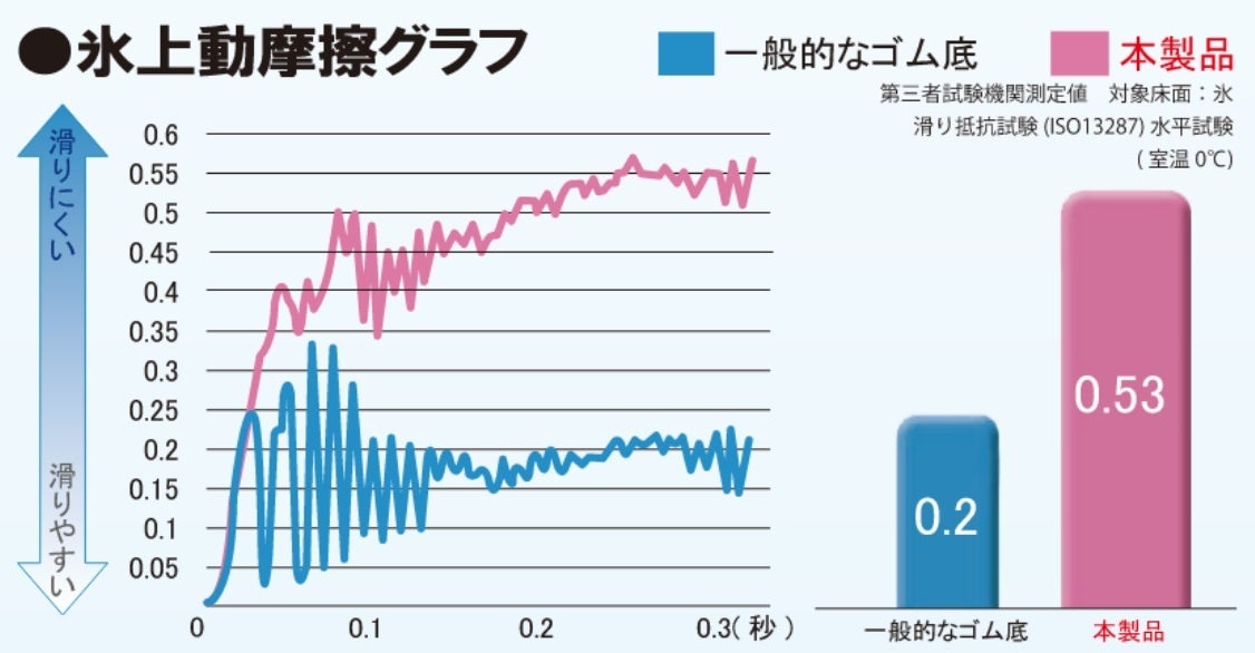 (HyperVスタッドレスソールは一般的なゴム底より2.5倍以上滑りにくい)